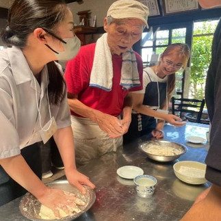いつものように講師が丁寧に指導してくれましたが、生地をこねて伸ばす作業は本当に重労働で、全力を尽くさなければなりません。何度も失敗を繰り返し、講師の助けを借りながら、ようやくそばを完成させることができました。