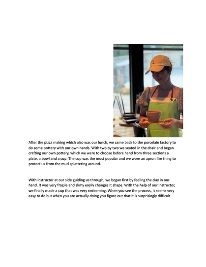 ピザ作り(それが昼食にもなりました)の後、私たちは再び陶磁器工場に戻り、自分の手で陶芸を体験しました。二人一組で椅子に座り、あらかじめ選んだ皿、ボウル、カップの3種類の中から自分の作品を作り始めました。特にカップが人気で、泥はねを防ぐためにエプロンのようなものを着けました。
