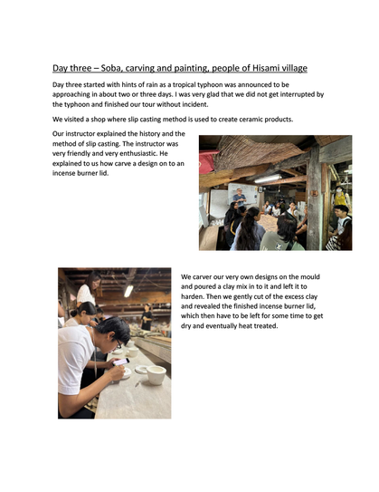 私は3日間、この村で学び、感じたことをそれぞれの日ごとに分けて紹介し、波佐見の文化や体験を自分の目と心でどのように受け止めたかをお伝えしたいと思います。