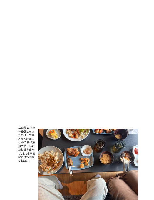 သုံးရက်အတွင်း အများဆုံးပျော်ရွှင်ခဲ့သည့်အရာမှာ သူငယ်ချင်းများနှင့် စားသောက်ခဲ့သော နေ့လယ်စာ အစားအစာ မီနူး စားနိုင်သည့် အခမ်းအနားဖြစ်သည်။ အမျိုးမျိုးသော အစားအစာများကို စားပြီး အလွန်ဝမ်းမြောက်မှု ခံစားရသည်။
