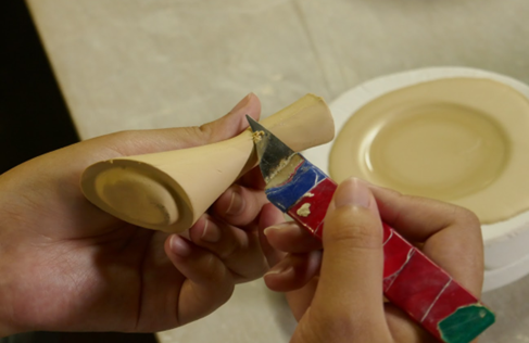 その後、粘土が形になるのを待ち、道具を使って余分な部分を切り取ります。