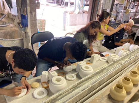 午前中は中尾山の陶芸工場へ行き、珍しい射出成形による陶磁器の製造を体験しました。射出成形陶器は、その名の通り、石膏の型に泥を流し込んで完成品に仕上げる陶芸です。まず最初に陶芸の先生が射出成形陶器の製造方法を説明してくれました。